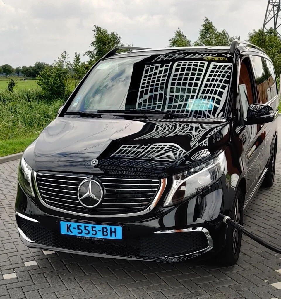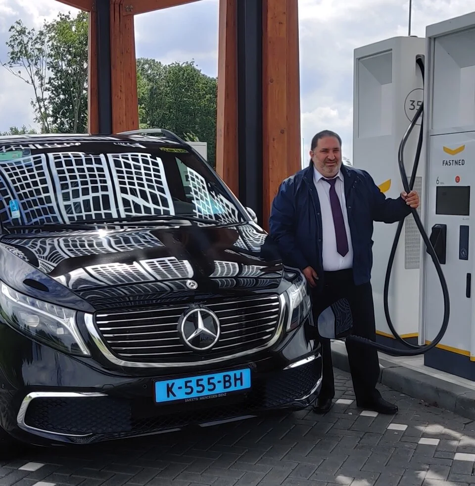 “De EQV rijdt geweldig! Weer heel anders dan een Tesla model.” Ibrahim Kocabiyik, chauffeur en eigenaar van de personenbus, is maar al te blij met zijn nieuwste investering. “Sinds maandag staat er een blauw kenteken op en vorige week is de wagen met vlag en wimpel goedgekeurd door de RDW.” Mercedes-Benz geeft aan dat de EQV een actieradius heeft van 355 km. Genoeg voor ritten rondom Schiphol, in de stad Amsterdam en voor enkele intercity trips. De werkelijke actieradius is o.a. afhankelijk van de uitrusting en belading van het voertuig. “Wat de werkelijke actieradius zal zijn bij alledaagse ritten, moet ik nog ervaren. Ik ben al blij dat ik niet meer in vervuilende personenbusjes rij en bijdraag aan een betere leefomgeving voor de volgende generatie.”